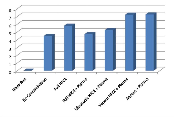 此外,縮短清洗流程(僅保留HFE超聲清洗+等離子清洗【ultrasonic HFE + plasma】)的樣品清潔度優(yōu)于完整HFE流程。這意味著傳統(tǒng)HFE流程可簡(jiǎn)化為兩步(超聲+等離子清洗),仍能獲得更高清潔度的表面。
